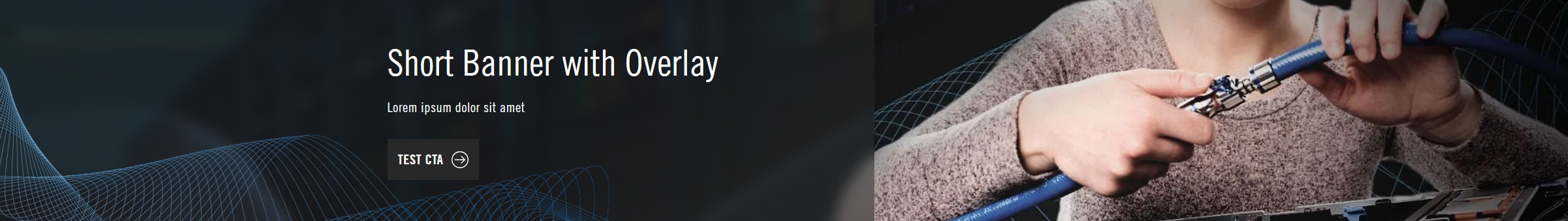 The Short Banner with Overlay is a thin banner-style component with a title, CTA section, and background image.
